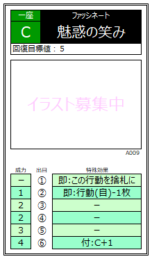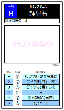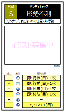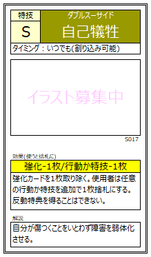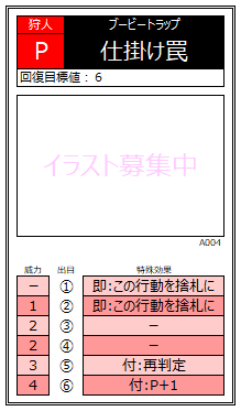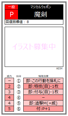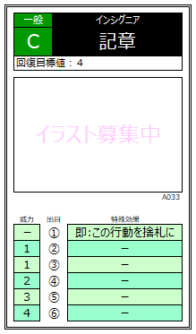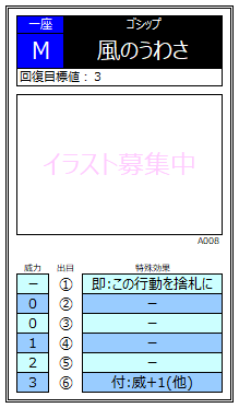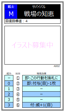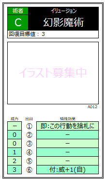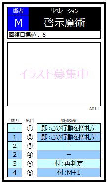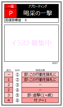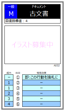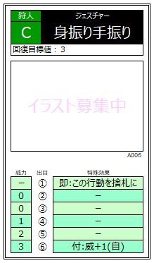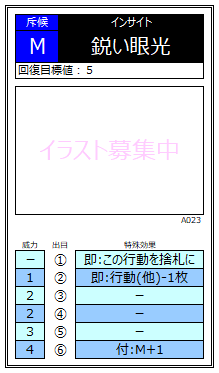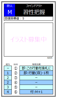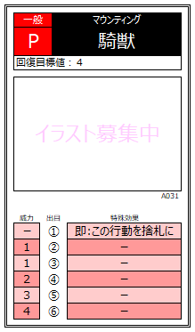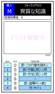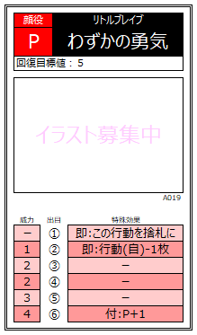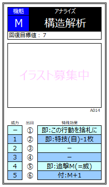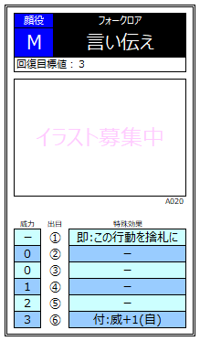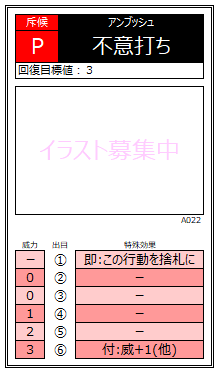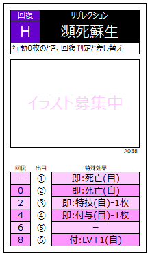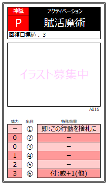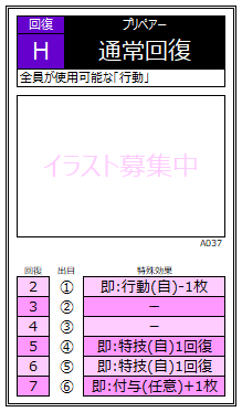 「行動」は捨札になるまでは何度でも使用可能。捨札から回復するための目標値が設定されており、目標値が高いほど回復しにくいが、威力は高い。